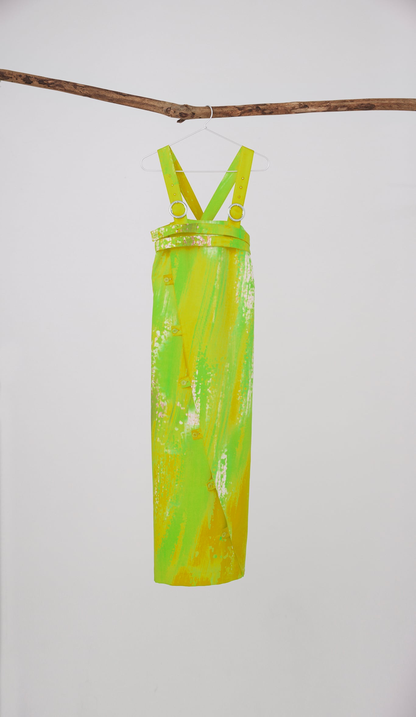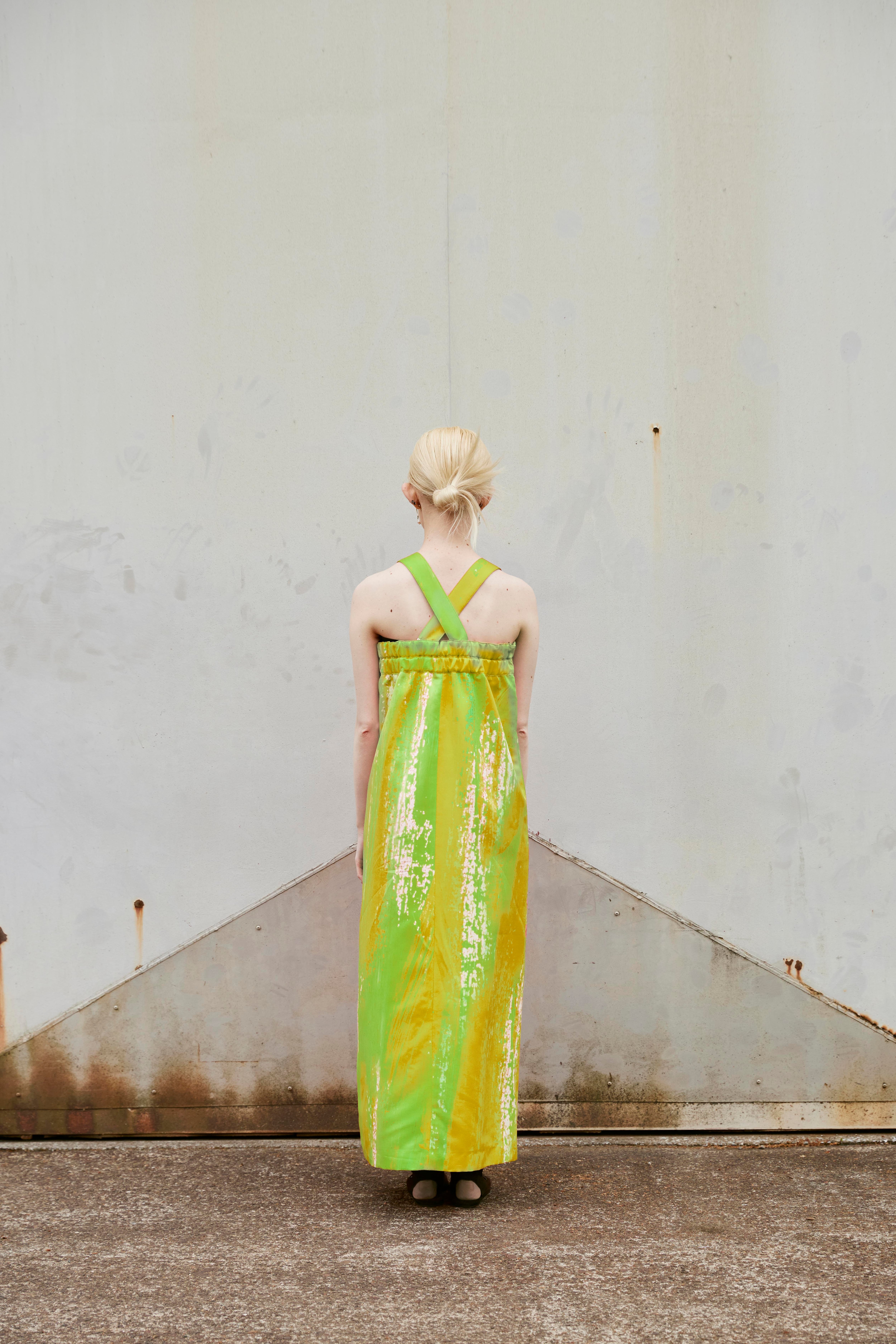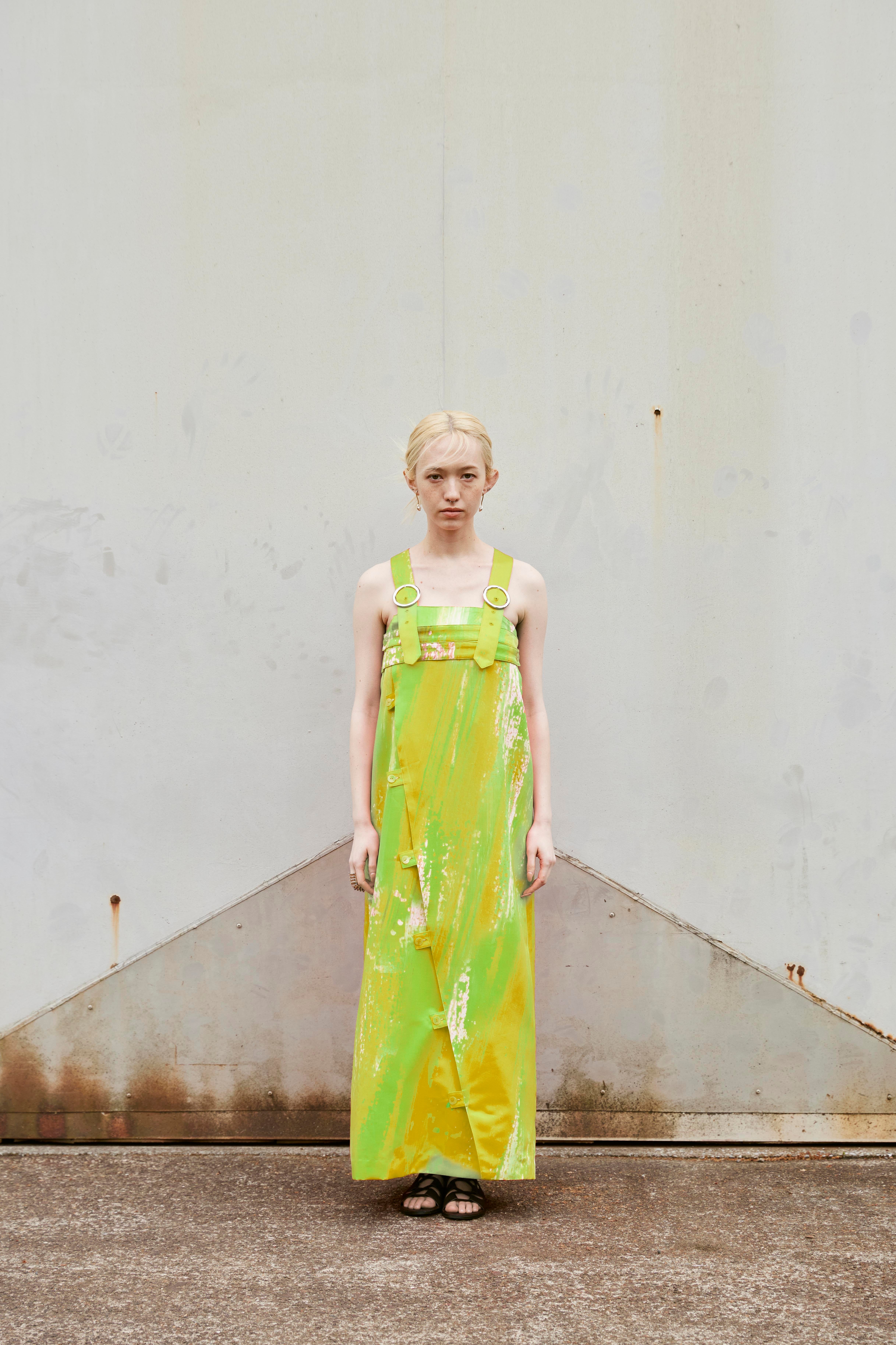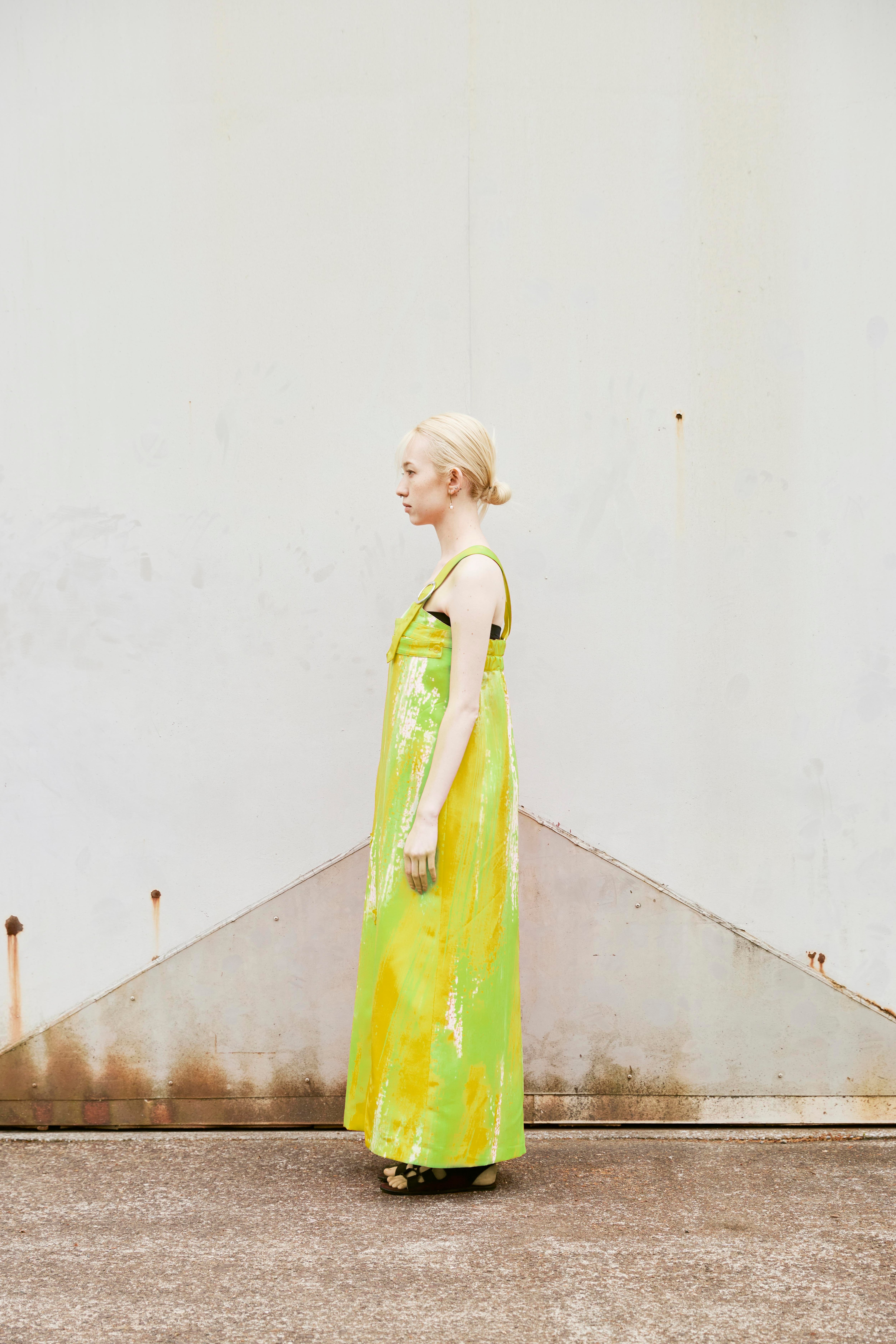 みずみずしいライムグリーンが印象的な、オーバーオール風ワンピース。