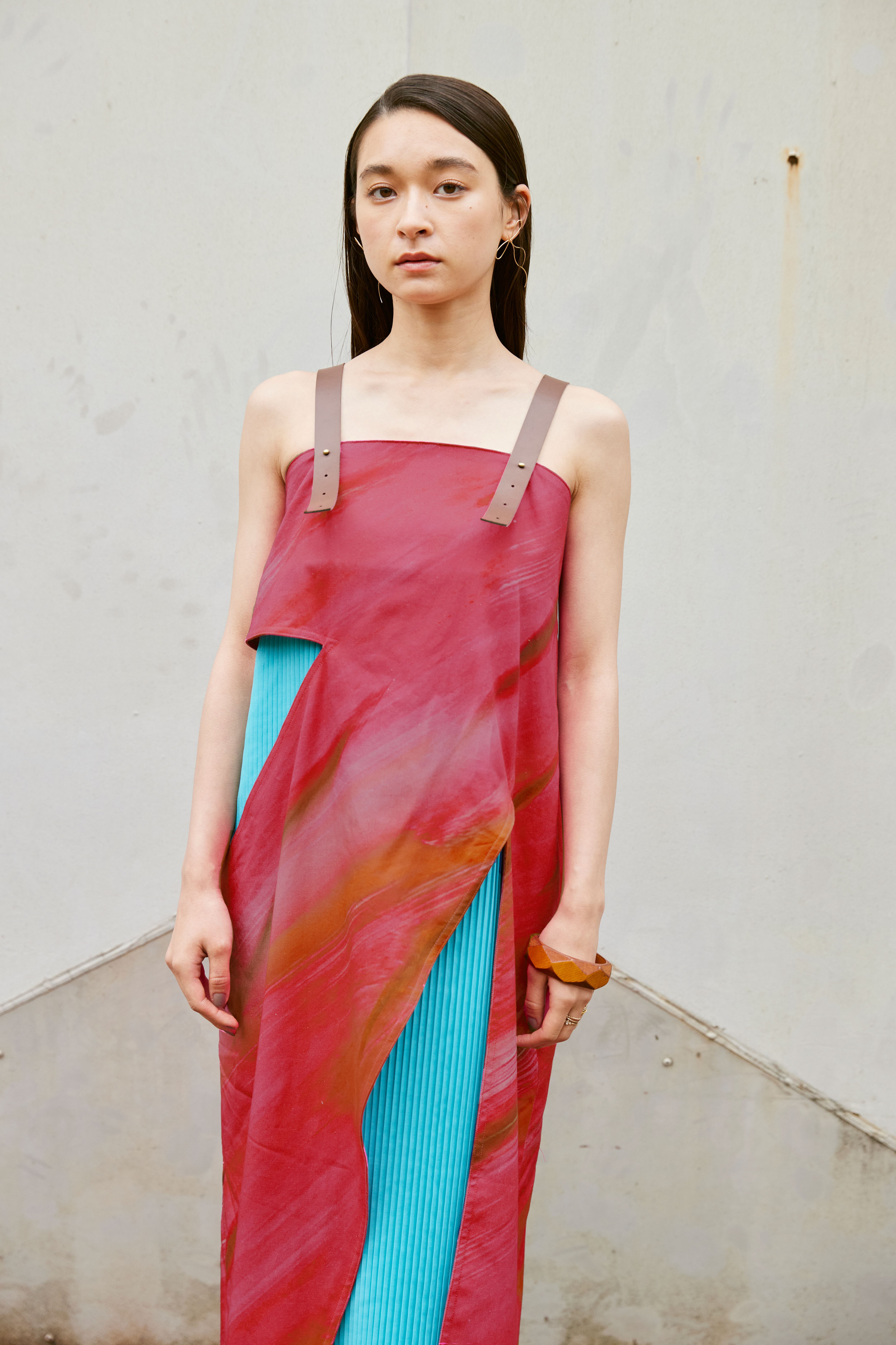 こっくりしたレッドの生地に大胆なスリットが入り、